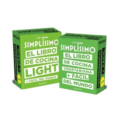 Dos magníficos libros con casi 400 recetas vegetarianas, veganas y light: fáciles de preparar, sabrosas, variadas, para todas las épocas del año y al alcance de todos los bolsillos. Recetas sabrosas y variadas: rollitos de primavera con aguacate, ensalada César con tofu, judías verdes con cacahuetes, tarta de hojaldre de puerros y cebollas, curry de boniato, risotto con alcachofas y aguacate, espaguetis con jengibre y soja, crumble de calabacín...en el SIMPLÍSIMO DE COCINA VEGETARIANA. Rollitos de primavera con pera, ensalada César, consomé de pescado y té verde, salmón con espárragos, salsas en versión light, postres tan apetitosos como ligeros..., en el SIMPLÍSIMO LIGHT. Los SIMPLÍSIMO funcionan así: un vistazo a la página, no más de seis ingredientes y rápidamente nos ayudan a cocinar los platos más apetitosos y saludables. En cada doble página de cada libro hay lo estrictamente necesario: - 1 foto de cada ingrediente - tiempo de elaboración - pasos a seguir: pocos y claros - y foto a toda página del plato resultante Una fórmula muy atractiva: - fotos bonitas y eficaces - poco texto y con letra clara y grande - pictogramas fácilmente identificables - con indicación de receta vegetariana o receta vegana